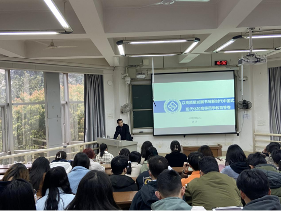 3月27日下午,成人有声小说党委书记龚涛在福庆楼T211教室为师生们主讲“开学第一课”,带领全院本科生、研究生干部及2022级硕士和博士深刻领悟“以高质量发展书写新时代中国式现代化的高等药学教育答卷”,勉励同学们从“开学第一课”中汲取奋进能量,在行动中践行党的二十大精神。