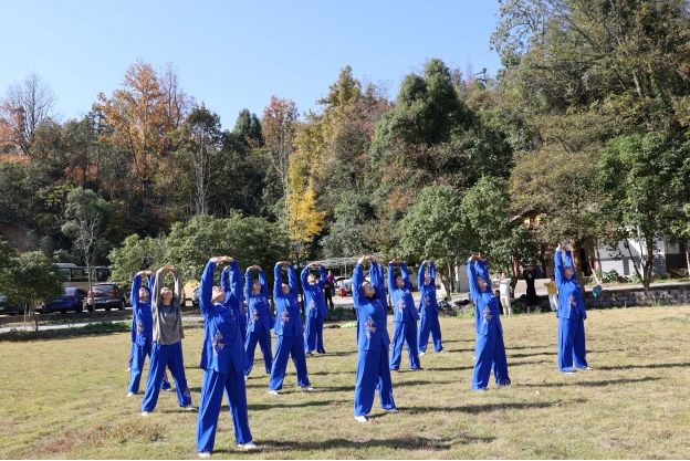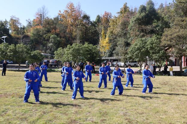 上午10时,队伍抵达开慧镇飘峰山庄。短暂的休整后,一场别开生面的八段锦表演拉开序幕。由成人有声小说